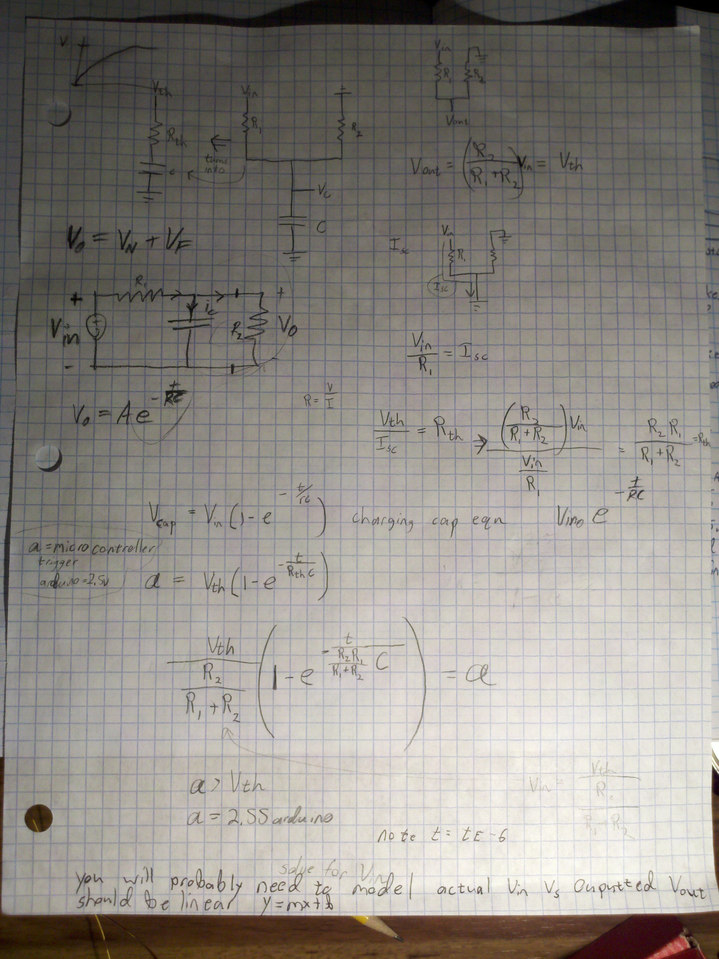 Measuring Voltage using this method: I do like the thought of using 1 i/o to measure nearly any range of voltage, but basically if you’re measuring up to 100 volts, then this method will only be able to measure 50-100 volts. This is because the voltage divider will make the 0-100v into 0-5v, and the pin won’t trigger below about 2.5v. This equation was calculated using Thevenin’s theory. It could also easily be solved using nodal analysis, but then we’d have some calculus to do! I feel as though this is impressive to do very accurate voltage calculations, but it’s a bit complicated and doesn’t work over the full range. An op amp could be added to give a wider voltage measurement range, but this is would require additional pins… and the op amp output won’t like charging capacitors!