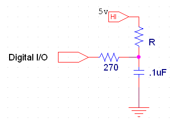 Let’s say that you’re trying to measure some resistance, but running low on analog pins. Maybe you’re using a microcontroller (aka micro) that’s purely digital, such as the parallax propeller. Well my friends this post is for you! Let’s consider the fact that nearly all micro’s digital pins trigger at 1/2 of the voltage they micro is being driven at. If we slowly increase the voltage of a micro’s digital input, the micro will consider it HIGH at 2.5+ volts for a 5v micro.