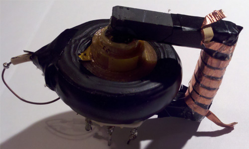 This is usually very easy and you can start off with some thin wire just to test the transformer and driving circuit. The ferrite core is often exposed quite a bit and easy to wrap a new coil around. I wrapped a thin layer of masking tape, then a layer of electrical tape. I then used four layers of copper tape normally used for stained glass, and I was sure to solder the ends together.