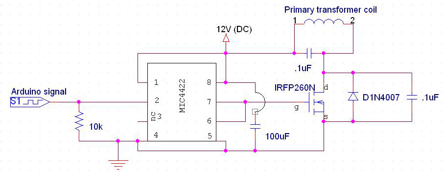 There are many different ways to build a flyback driver. Mine uses a micro controller, in this case an Arduino, and a high power N channel MOSFET. This makes the circuit extremely simple to build and only has a few components. We’re going to be running this circuit at around 20kHz with a lot of current. To make things simple I’ll be using a Mosfet Driver, and this will allow us to easily achieve 12v gate-source voltage differential to minimize drain-source resistance, and the driver will quickly charge and discharge the gate-source capacitance, since it’s a high current half bridge.