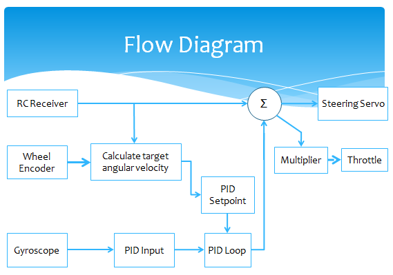 So we tried to come up with some creative content and thought it would be a great idea to stabilize a vehicle with as few sensors as possible and incorporate a gyroscope. In the end we had two sensors: a gyroscope and a wheel encoder. We also needed the angle of the front wheels, but we assumed the steering servo would maintain whatever angle we were sending it, so that really makes it three inputs.