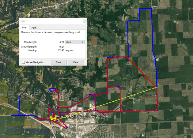 4.27 miles! yellow line represents base station to tag largest distance